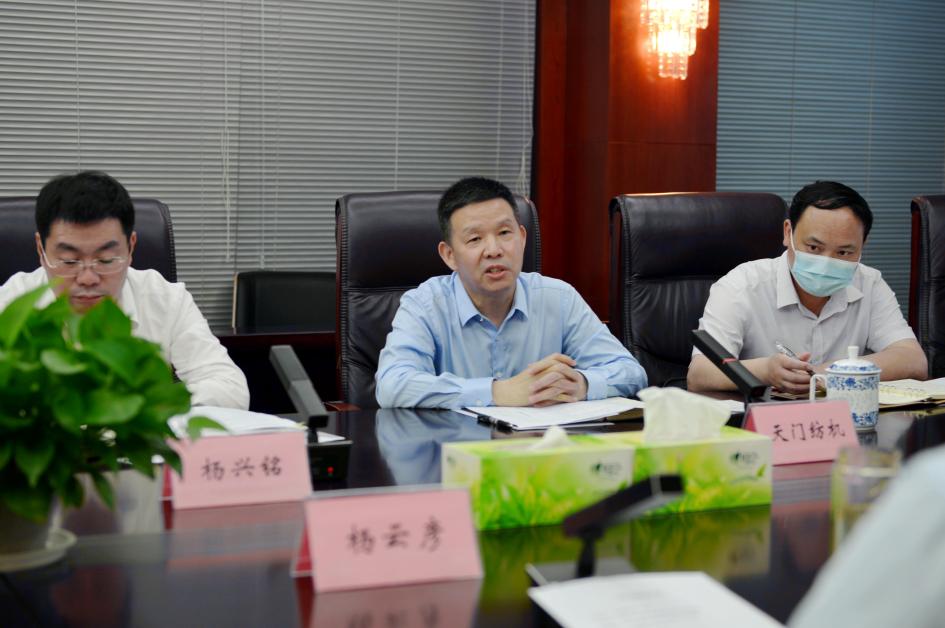 楊云彥副省長深入天門紡機生產現場了解生產經營情況后,在座談會上聽取了天門紡機、天門通威生物科技有限公司等企業負責人的工作匯報。