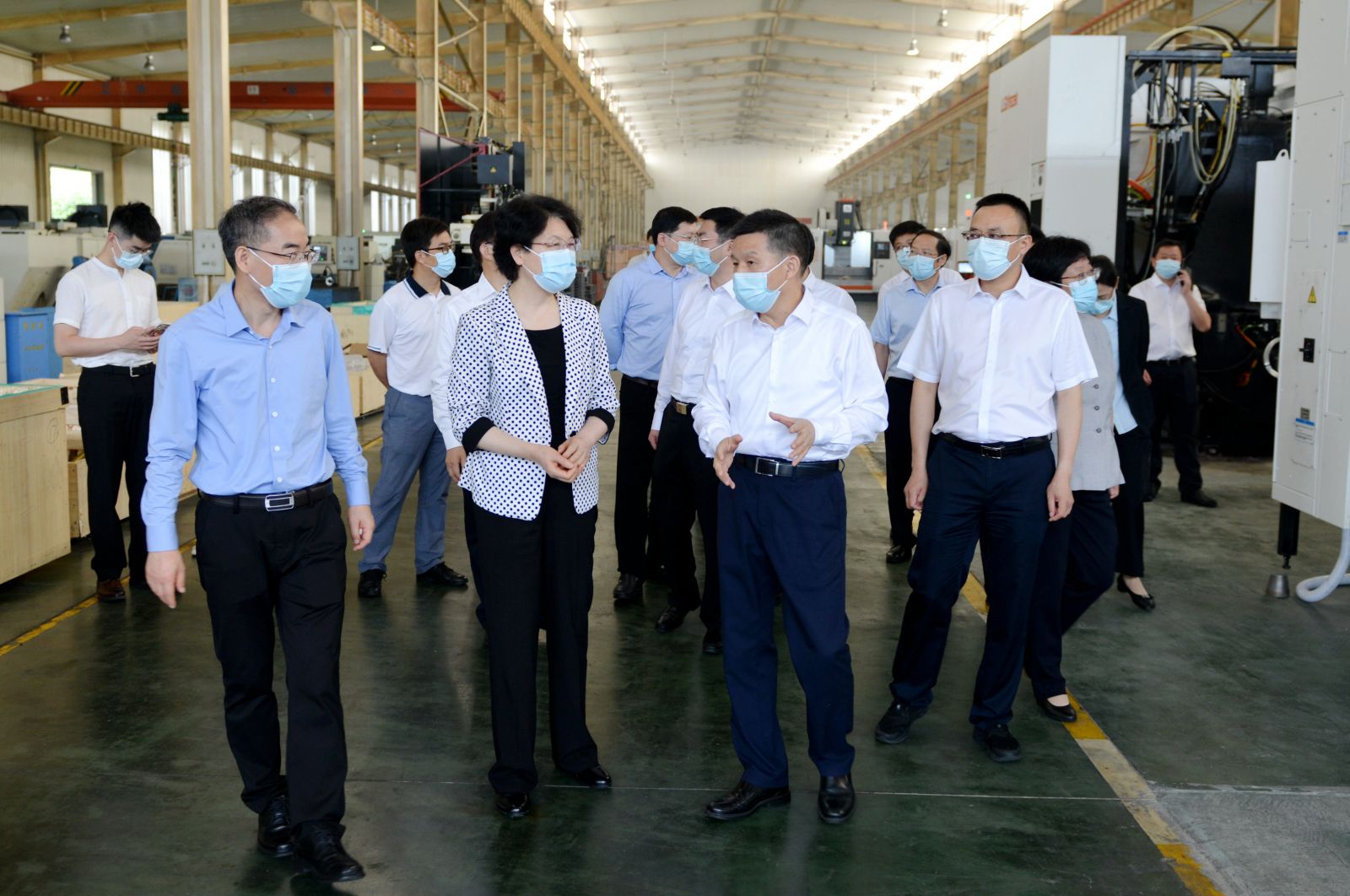 當調研組來到天門紡機加工車間時,大家眼前一亮,一排排近期安裝到位的新設備高大威武,引人注目。沈方勇董事長向肖副省長介紹:從2020年開始,我們就著手推進“智慧工廠”項目建設,眼前的這些數控設備以進口為主,大都是國內外一流品牌。下一步我們將進行信息化升級改造和倉儲物流自動化改造,最終實現生產制造柔性化、倉儲物流自動化、信息管理現代化。聽到天門紡機大手筆推進技術改造的情況匯報,看到眼前一臺臺嶄新靚麗的設備,肖副省長十分欣慰,把隨行的省科技廳負責人叫到身邊,叮囑他們今后要多到企業調查研究,無論是資金還是技術,一定要給予關心支持,落實落地有關科技扶助政策。