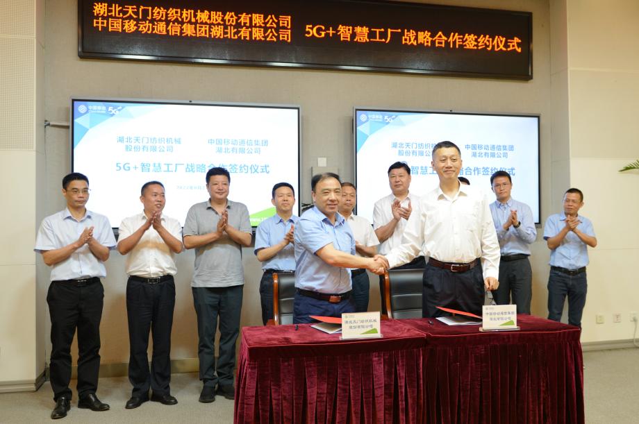 天門市委常委副市長曾令慧、經信局副局長宋鵬等領導出席了簽約式,全國人大代表天門紡機董事長沈方勇、全國人大代表湖北移動黨委書記董事長范秉衡分別致辭,天門紡機總經理焦倫進、湖北移動副總經理劉焱宇簽署了“5G+智慧工廠”戰略合作框架協議書。