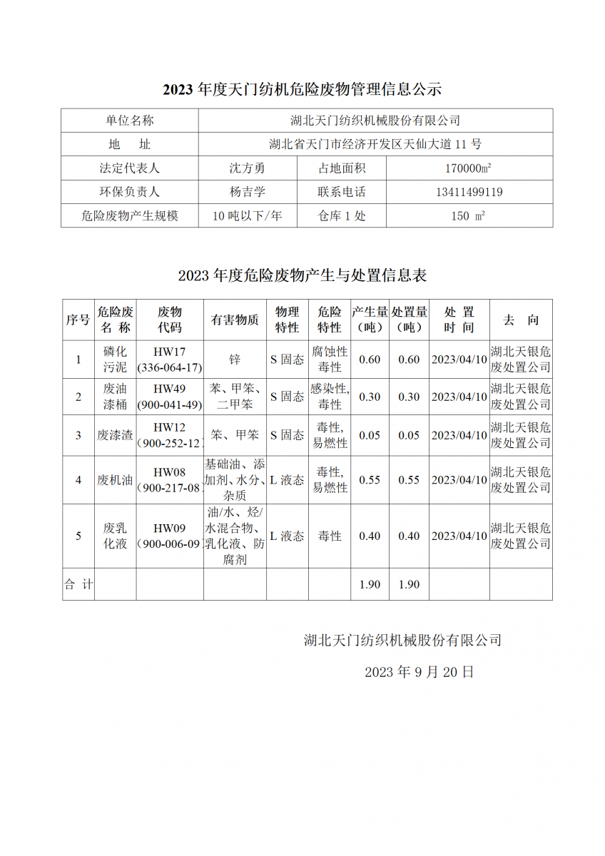2023年度天門紡機危險廢物管理信息公示
